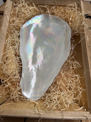Deze oesterschaal van ca. 40 cm is een uniek, handgemaakt stuk aardewerk met een prachtige parelmoer afwerking. De subtiele glans laat oesters en andere zeevruchten schitteren op tafel. Elke schaal is met zorg gevormd en daardoor één van een soort. Verpakt in een authentieke oestermand, waardoor het niet alleen een blikvanger is tijdens het serveren, maar ook een bijzonder en origineel cadeau voor elke liefhebber van culinaire schoonheid. Elke schaal is uniek, zie detailfoto’s!